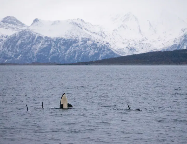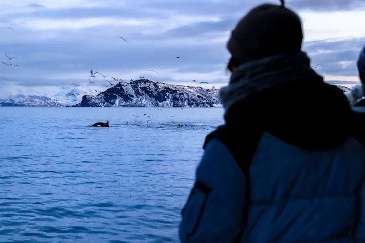 Whale Safari in Tromsø, available sometimes from end of October to the beggining of February. Get up close with magnificent humpback whales, killer whales (orca), and fin whales in their natural habitat, and immerse yourself in the stunning beauty of the Arctic.