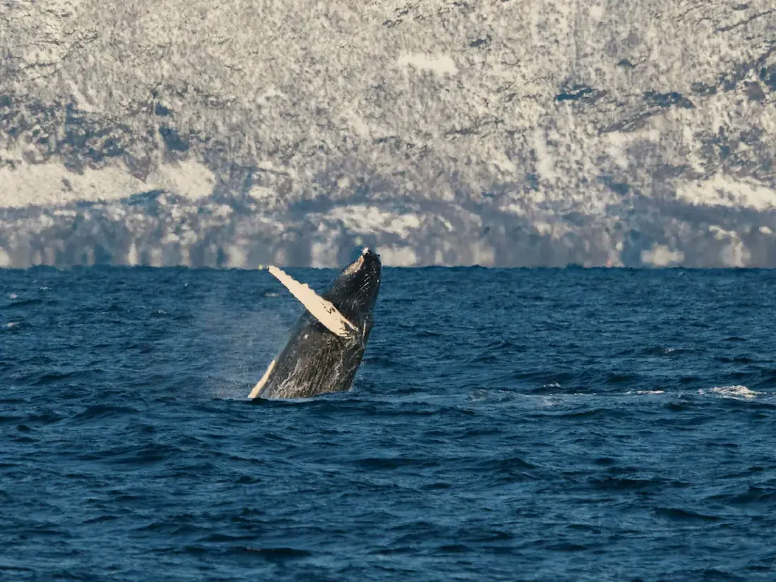 Humpback whales are known for their acrobatic breaches and exceptionally long pectoral fins. They undertake epic migrations, gathering in Norwegian waters during winter to feed on schooling fish, often using unique bubble-net feeding techniques.